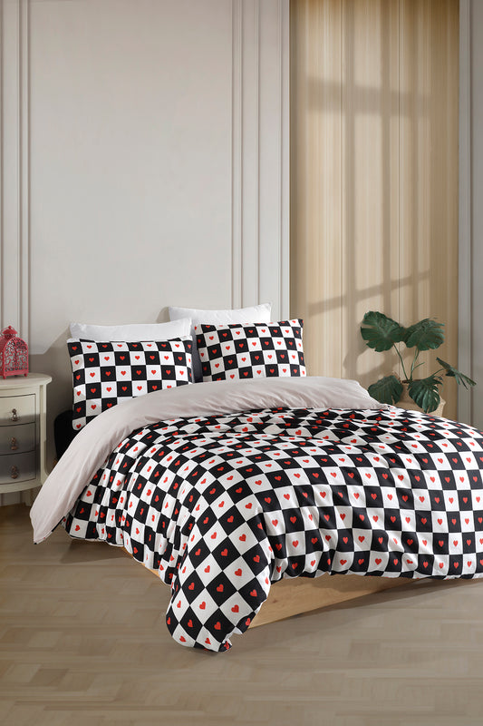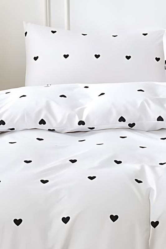 Tek Kişilik Lastikli Çarşaflı Nevresim Takımı | Siyah Kalpli Tam Takım